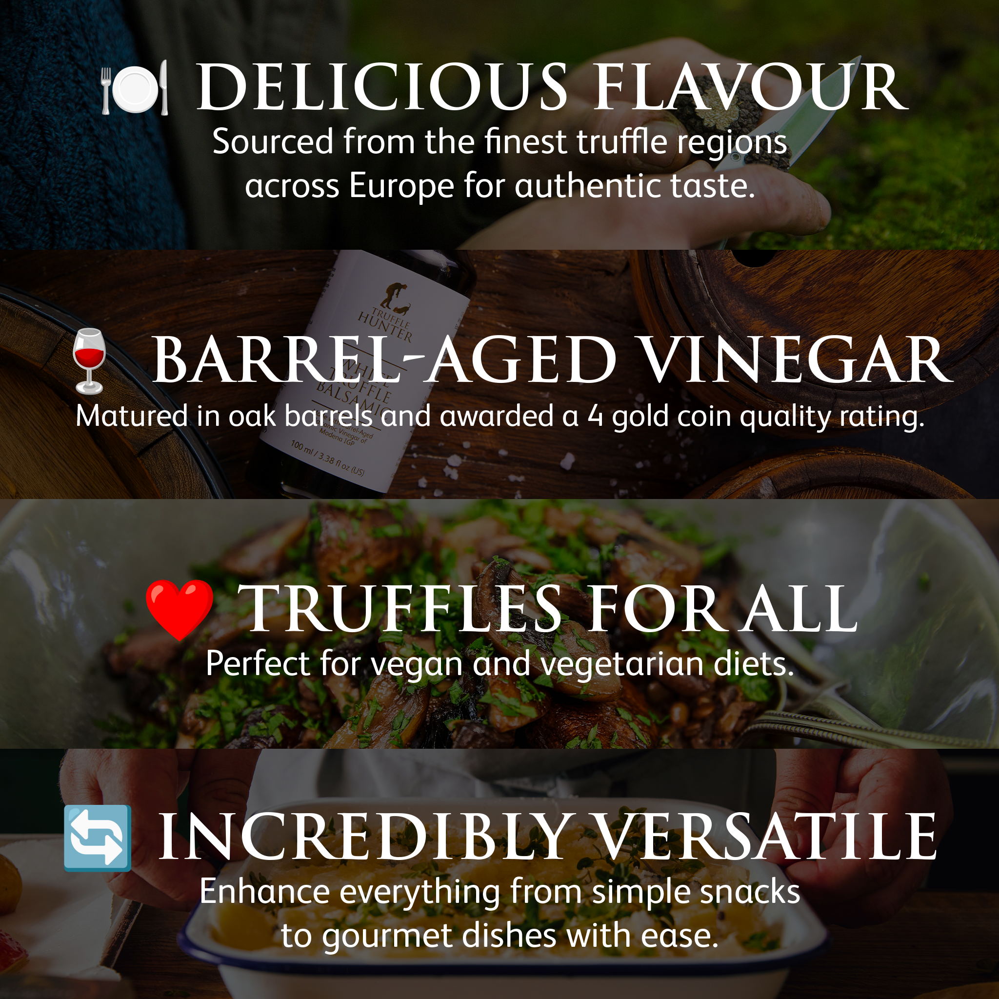 We use the finest 12 year old Barrel-Aged Balsamic Vinegar of Modena PGI, a premium Italian aged Vinegar classified with 4 Gold Coins, and we infuse it with high quality European White Spring Truffles (Tuber Borchii). A combination made in heaven.